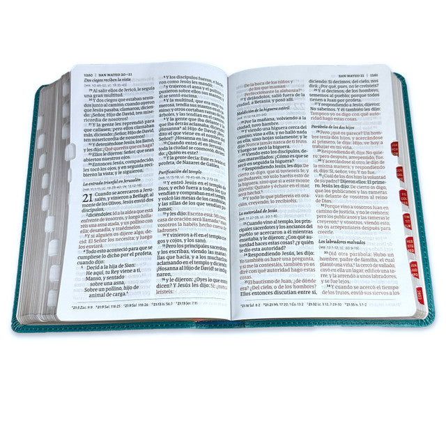 El tamaño de Biblia más popular, por combinar un diseño legible con un tamaño práctico. El tipo de letra es estético y cómodo para el lector.